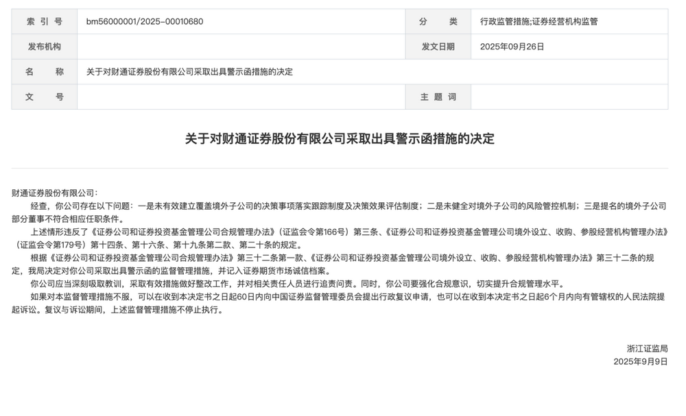 其二,未健全对境外子公司的风险管控机制。这是此次处罚的核心问题,监管明确指出,财通证券未能构建起对境外子公司的有效风险隔离与管控体系,使得跨境经营的风险敞口扩大。