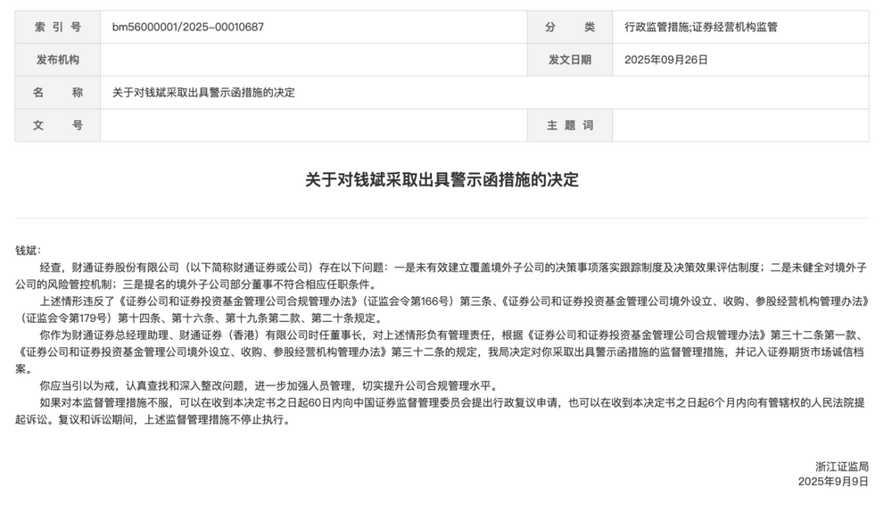 浙江证监局此次对财通证券及直接责任高管“双罚”,清晰传递出监管层对券商境外业务风险“零容忍”的强硬态度,以及强化机构和个人责任的监管导向。